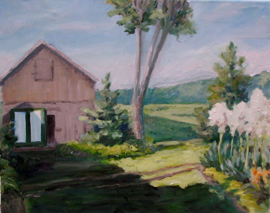 First of all, the tree was right in the middle of the painting. This is very poor composition as it divides the canvas in half. It was also a weird looking tree but that may have more to do with the fact that a tornado blew through the farm a few years ago wiping out 80 year old maples. Nevertheless, I decided to move it closer to the barn (easy to do in paint, right?) and to juice up the colors. I also decided to push the background way back. Too much green. And to clarify some of the focal points. What do you think?