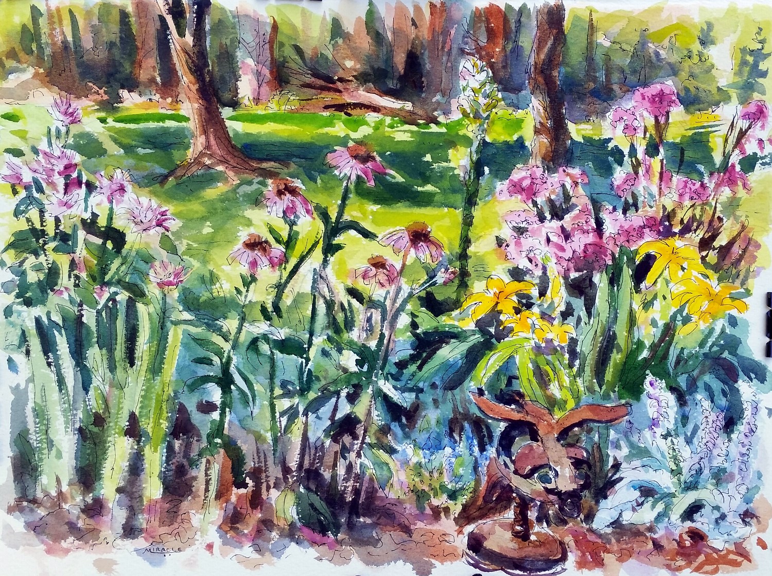 Yesterday, before I could get overly involved in the rest of the home tasks, I trucked my painting gear out to the front yard and painted this flowerbed which has been calling me for weeks. It seems to be a symphony of purples, mauves, and yellows this time of year. The heat was oppressive. The humidity was drenching. But I had a great time.