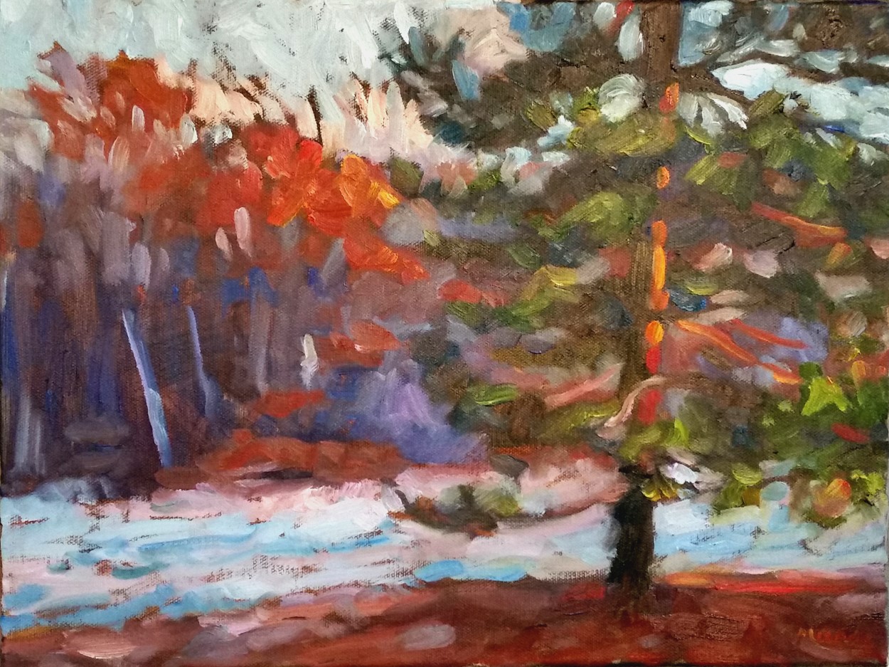 The final painting is just a glance out my bathroom window one frosty morning. Love the early morning light catching the pine tree with the colorful woods behind. Not so successful capturing the feeling of frost. It looks more like a river or lake but there you have it. As any experienced artist knows, not every painting turns out as we wish. But we always learn something, even from our failures.