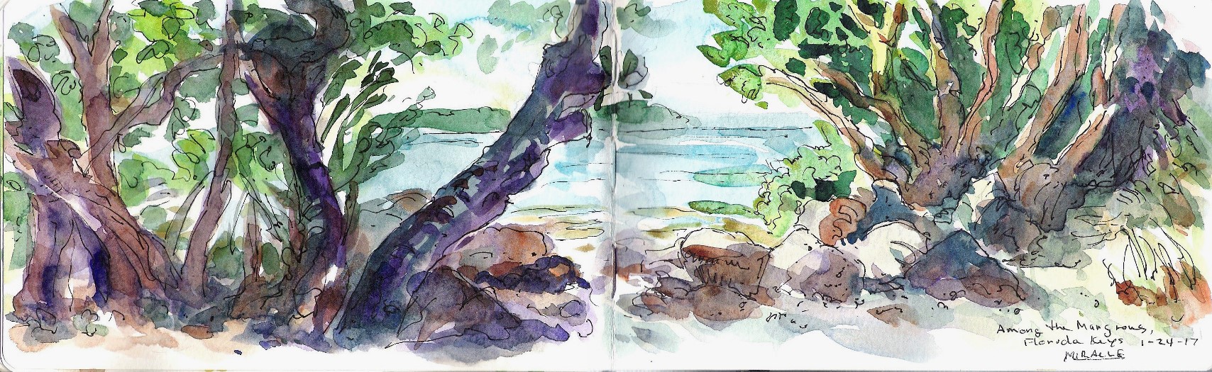 One of the nicest parts about the Keys is that there are so many places that visitors can pull over to fish…or in my case…paint. The Pentalic Aqua Journal (5 x 8) is perfect for painting broad landscapes. In the first painting, I was sitting in the shade while trying to capture the feel of being tucked away in the mangroves. The photos don’t do justice to the amazing aqua waters but it’s a nice memory.