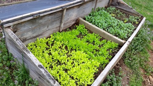 Lettuce in cold frame – black seeded simpson, bibb, siberian kale, and mixed kale. Planted mid February.