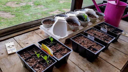 Starting seeds in greenhouse. The mousetraps are because the mice kept digging up the seeds!
