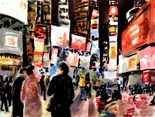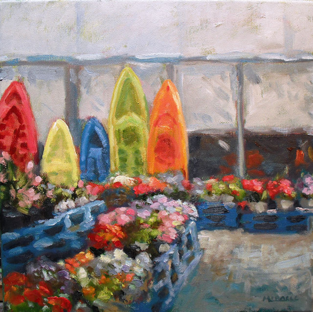 Watching all the shoppers come in for holiday, I thought that I might stick with the flowers theme and went to the other side of town to paint in the Walmart garden center. It was an awesome display of flowers! Again, I found an out of the way spot to paint. I was particularly enamored with the bright colors of the kayaks propped against the building contrasting with all the flowers. You have to develop a pretty thick skin to paint in such a public and well-trafficked space but it didn’t bother me at all. No one from the store came up and asked what I was doing but I did have a few customers asked if I worked there. It must have been my painting apron. Ha ha.