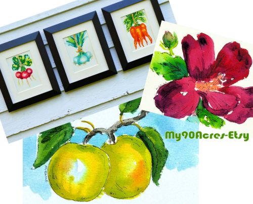 Within a week, I had set up a new Etsy shop, My90Acres with the intention of focusing on artwork related to the theme of this blog, i.e., living in the country. The paintings are all original watercolor / pen and ink sketches, matted to 8 x 10. These used to be my bread and butter item when I did the art fair circuit for 25 years. Very popular with buyers who want to add a pop of color to their kitchens and living spaces. Afterall, just how much grey can we live with these days? And they’re small enough to fit into those awkard spaces in your home, on the soffits over the cabinets, between the cabinets and the counter, between windows, or even on a shelf. I had customers who would come by my booth every year to add a few more paintings to their collection.
