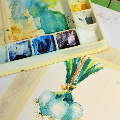 A couple of months ago I had lunch with two old friends from high school. We hadn’t seen each other for decades so there was much to catch up on – families, careers, retirement, etc. We had such fun. As the newest retiree in the group (just since May), I was curious about how they spend their time. As it turns out, my friend Susan started an Etsy shop. We talked some more and I thought I could probably revive some fruit and vegetable paintings that I used to do when I was traveling the art fair circuit. Later, when I returned home, I looked at my friend’s shop DoodleDogDesigns (cute personalized doggie bandannas) and was impressed by how professional it was….and how many sales she has had! Wow, who doesn’t need a little extra income?