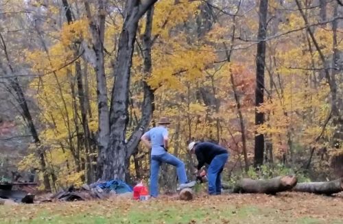 Our wood pile is growing. Today the guys dragged several logs out of the woods as it’s easier to cut and split them all in one place, plus they handle the wood less than when they cut and split it in the woods. Thanks also to our son who came home for the weekend to help out. This is hard work!