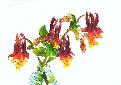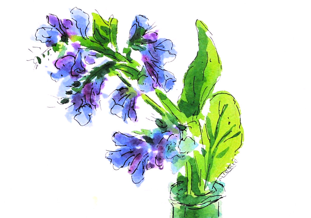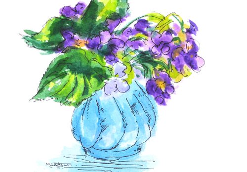 Here are three samples of yesterday’s work, all done in watercolor with pen and ink overlay. For efficiency, I use a quarter sheet of watercolor paper (about 11 x 15 inches), divide it into four boxes of 4 ½ by 6 ½ with margins between and surrounding. I tape the whole thing onto a board and then hand sketch each subject. This is the same technique that I use for the fruit and vegetable paintings. I have been using this method for about 30 years and it works for me.