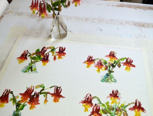 Then I paint each sketch with watercolor. The tape around the edge is enough to keep the heavy paper from buckling. When the paint is completely dry, I then add an overlay of India or carbon ink. I like my Platinum pen with the cartridges, but my first love is a quill #104 with India ink. As you can see in the photos, each painting is slightly different although the subjects are the same.