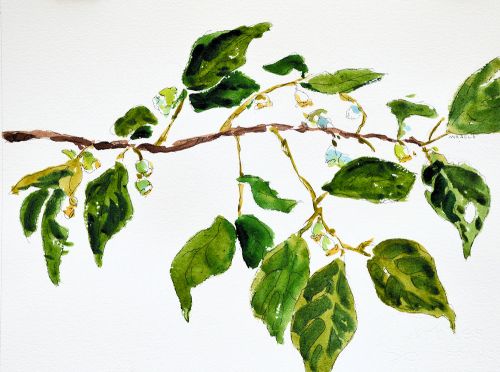 Persimmon flowers. These waxy, bell-shaped flowers on the persimmon tree will yield wonderful fruit in late summer. Watercolor, pen and ink, 10.5 x 14. Kit Miracle