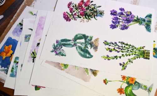 Pile of paintings. This a a stack of recent flower paintings, usually four to a sheet. Watercolor, pen and ink. Kit Miracle