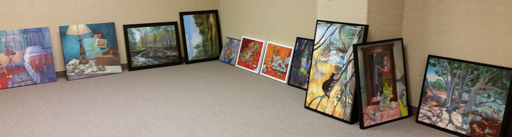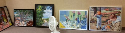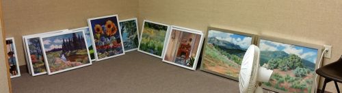 Gallery shot 3. Even more paintings waiting. These smaller pieces (16 x 20) can be double hung to save space.