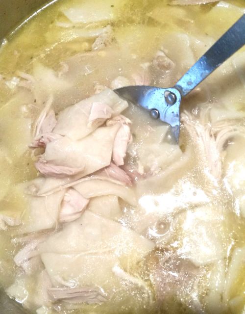 After you have brought the seasoned broth back to a boil, add the cut dumplings into the simmering broth, a handful at a time. Stir a bit to keep them from clumping together but they’ll rise to the top when cooked. Then add the deboned and cut up chicken back to the pot and again simmer. The dumplings will usually thicken the broth but you can always use a little cornstarch and water to thicken it. Or if you need to thin it, add some more chicken broth or water.