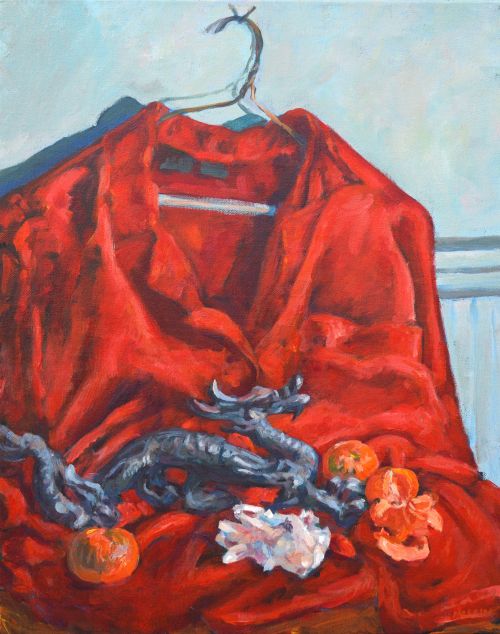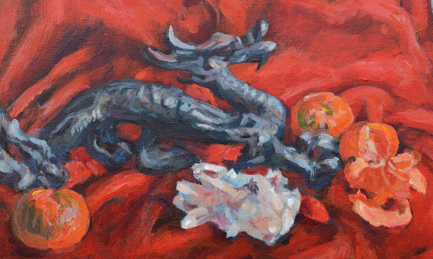 This is the sixth painting in my Lucky Red series. There are more symbols of power and good fortune in this set up. The still life arrangement plays off the many shades of whites and reds with a little green for eye relief. I love the way it glows.