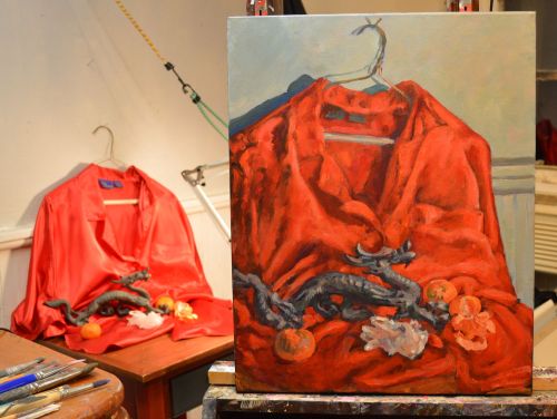 Lucky Red #6 – White Elephants. This is the set up as I had it in my studio. There’s a lot of eye/hand coordination when painting a still life, or anything from life actually. Mostly, it’s a matter of practice, practice, practice.