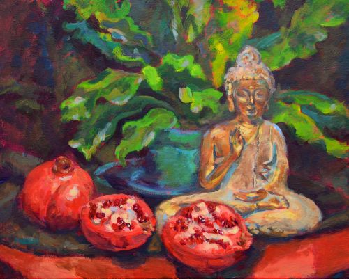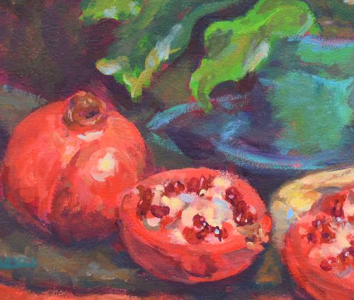 Again I have placed a pomegranate in the painting. This symbolizes fertility as do the apples in addition to knowledge. The martini glass is just for fun. Of course.