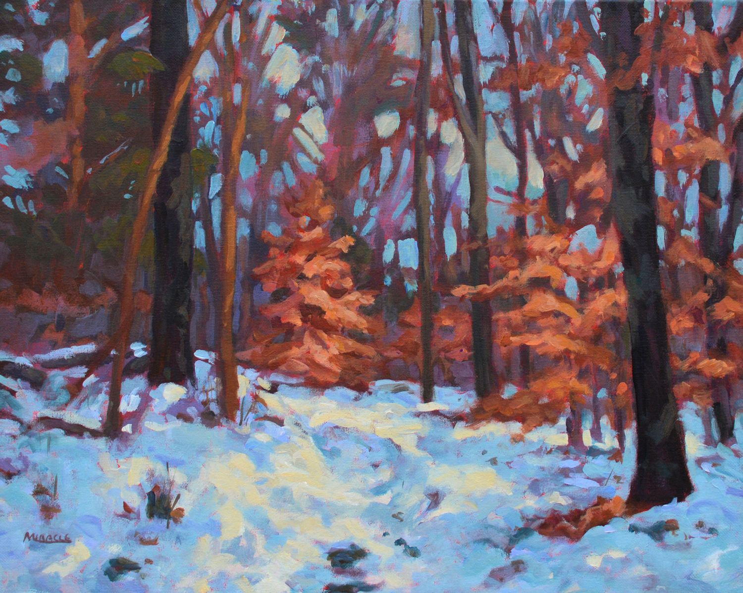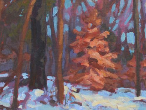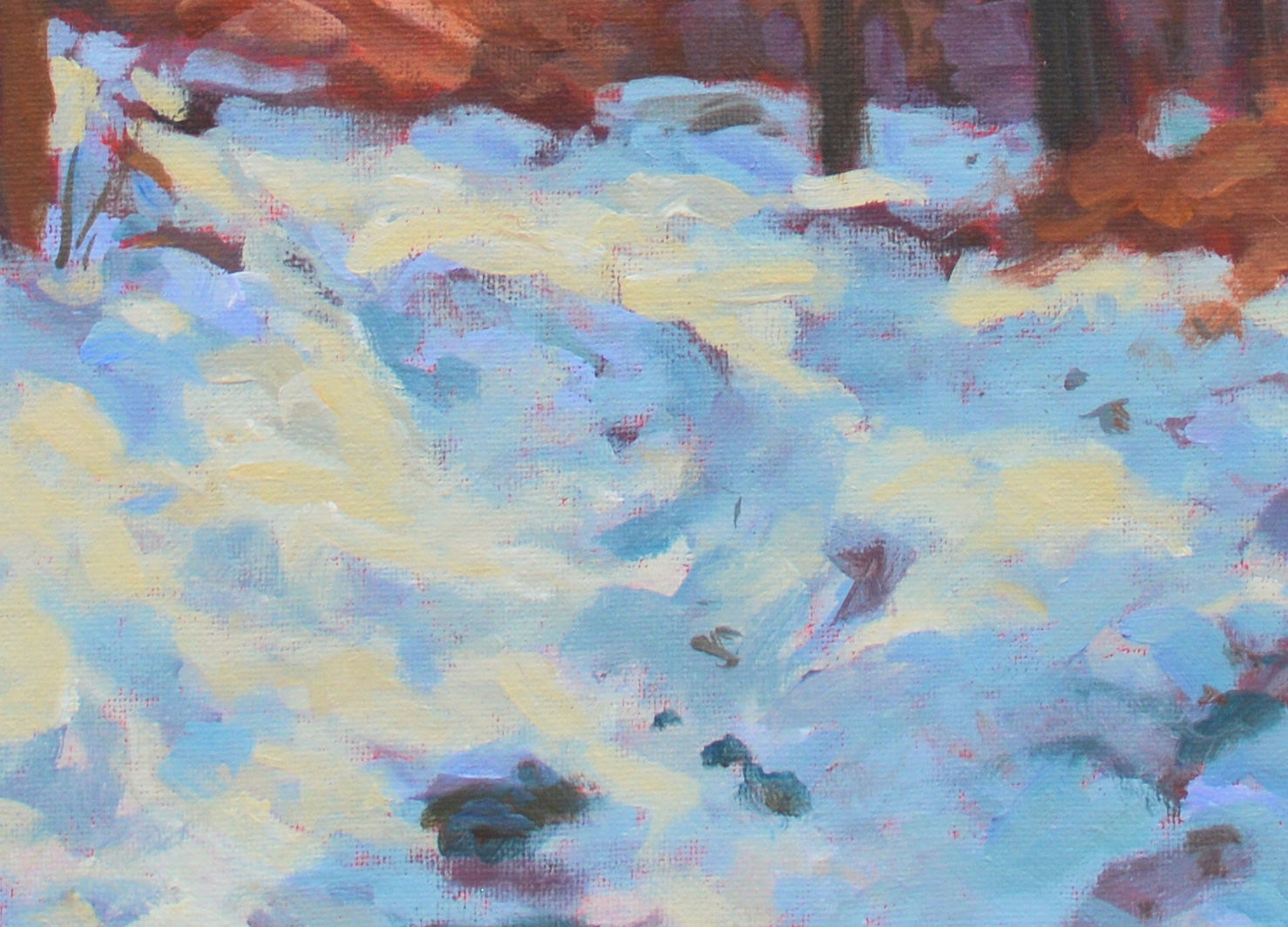Beech Trees in Winter, detail 1. This is the road through the woods. I probably made the snow look deeper. And I’ve learned over time that white will often look brighter with a little yellow thrown in than just plain white. It certainly catches that sunlit feel.