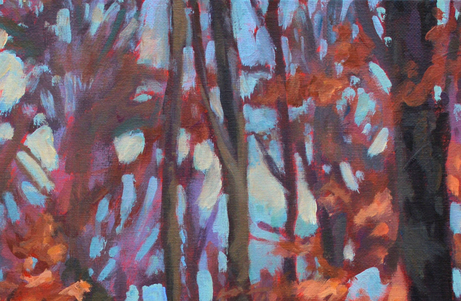 I usually start with the darks and then add the midtones and then the lights, starting at the top of the canvas. As I was painting, I realized that the painting was a bit drab with the overcast sky and muted shadows. Although the beech trees gave it some color, I want to put more oomph into it.