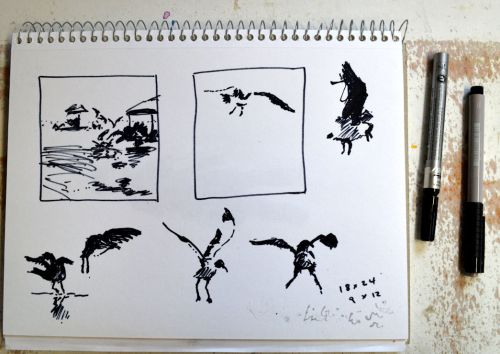 As you can, my original photo was wider than the format I chose (16 x 20) so I cropped it to a more interesting composition. I divided my canvas into thirds each way (nine squares) and drew directly on canvas with a brush loaded with a darkish color. The canvas had been primed in red.
