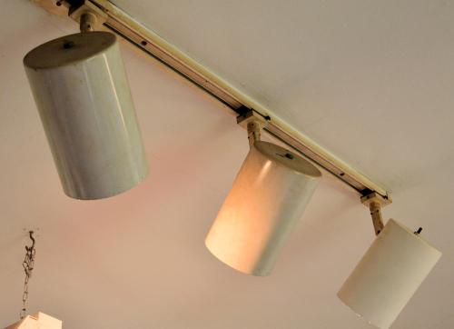 Old can lights on a track lighting strip. These get pretty hot but are useful for studio painting displays. I’ll probably replace them in the future with smaller LED or halogen lighting.