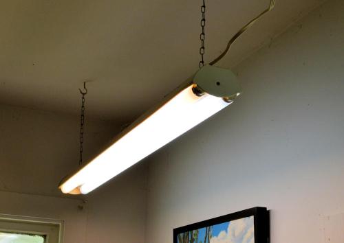 Fluorescent lighting fixture with a cool bulb and a daylight bulb for balance. Great for a broad work space such as framing and matting.