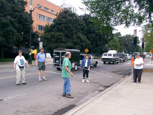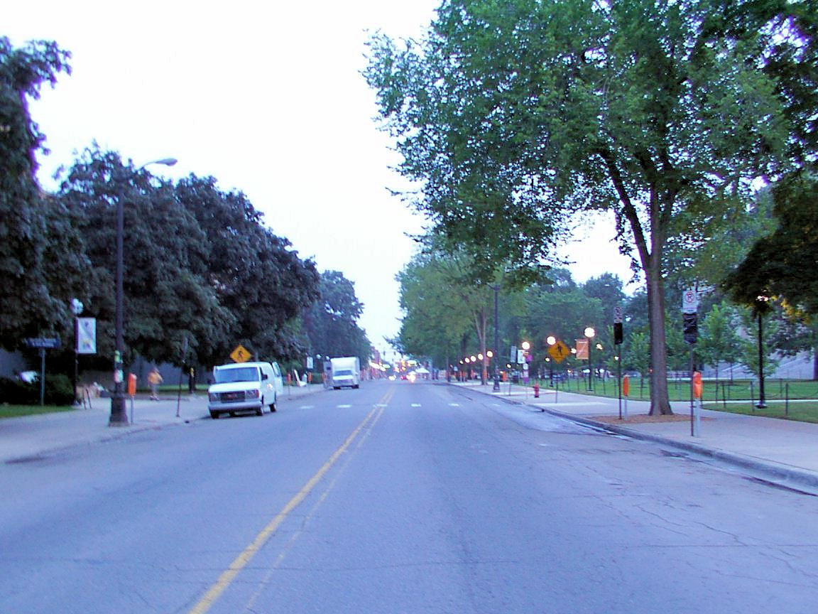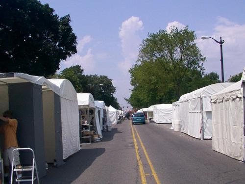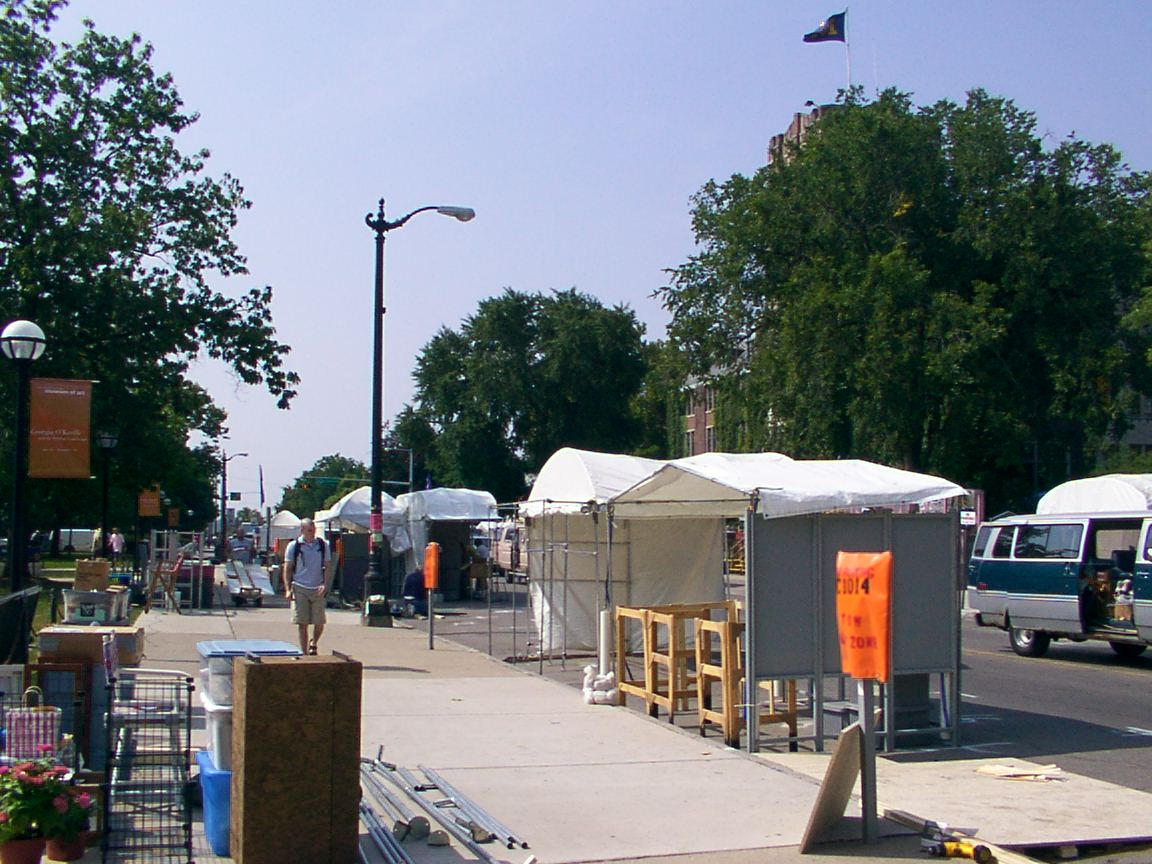 This is what the street looks like at 6:30 in the morning on the day of set up at Ann Arbor. This is one of the top ten art fairs in the country, with three fairs going on simultaneously. Plus every merchant has a sidewalk sale and everyone with a front yard is selling something. That is the student union in the background.