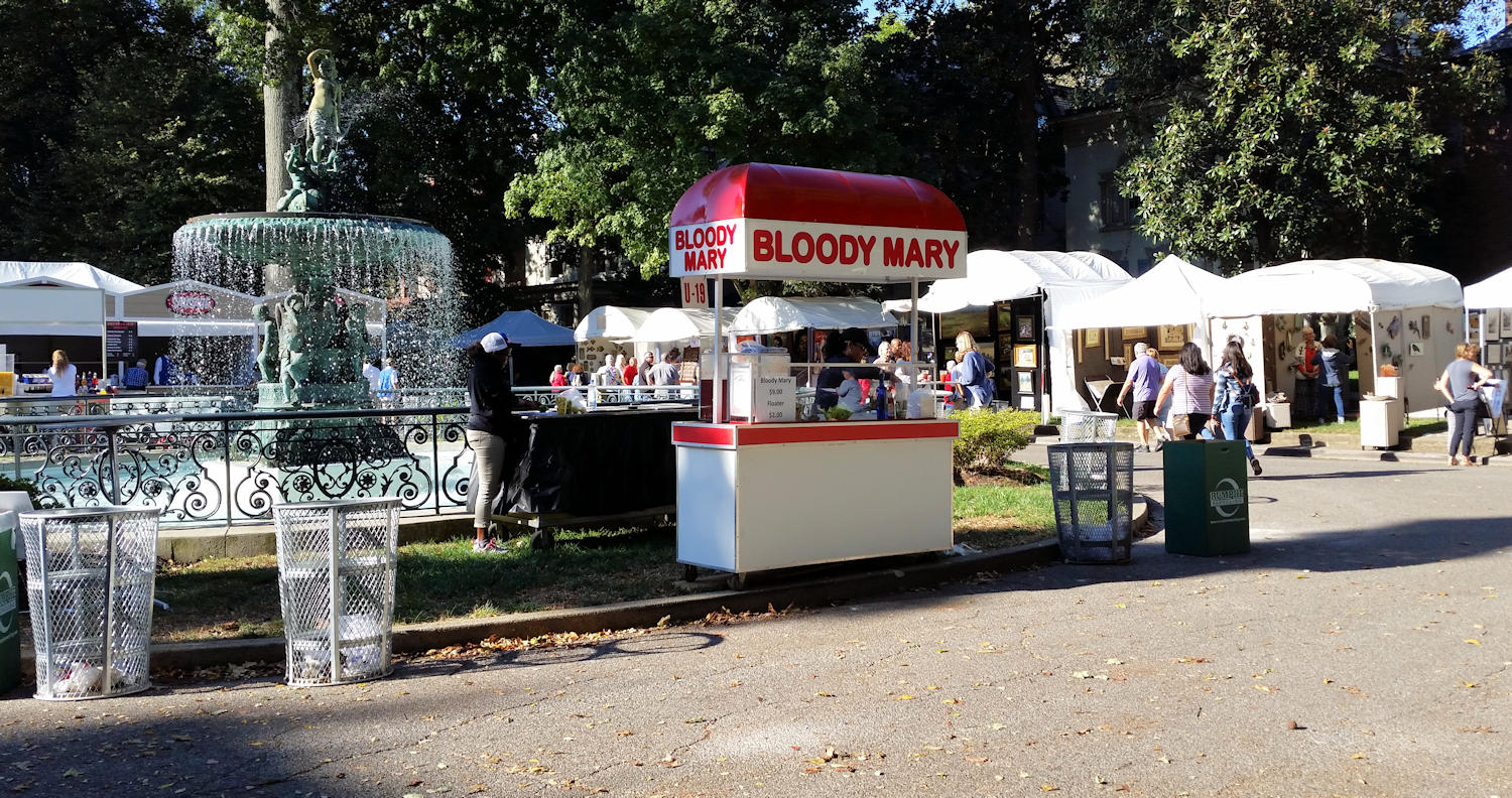 The beautiful fountain at the center of St. James Court. It’s beauty is somewhat dimmed by all the lovely art booths. The line at the Bloody Mary booth quickly formed when the fair opened.