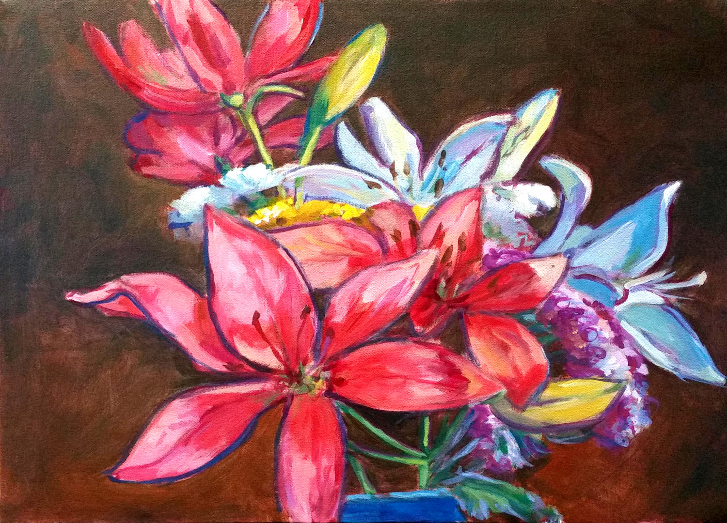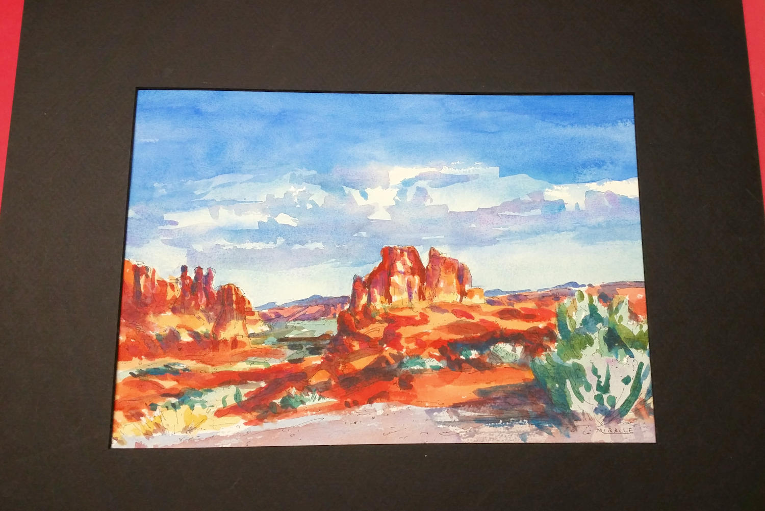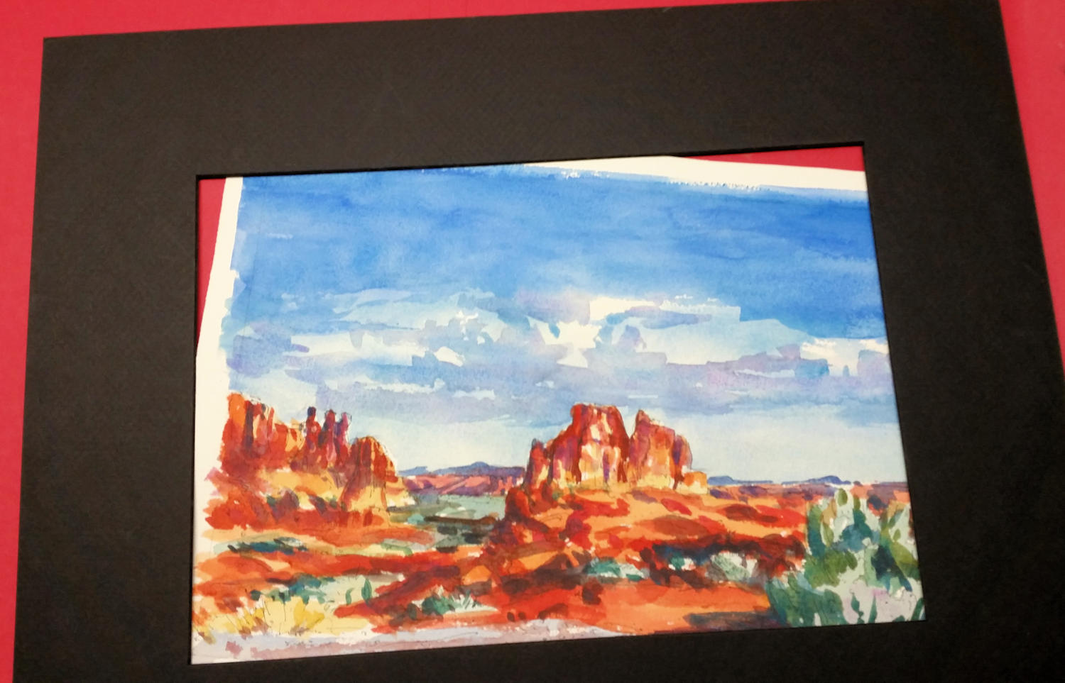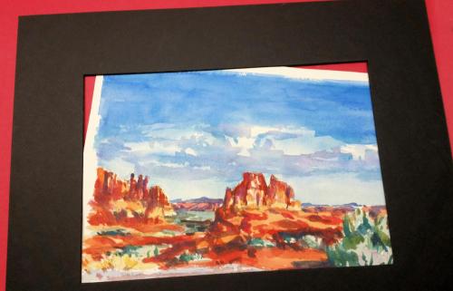 A small painting with a ready-cut mat and backing. The painting has a border around it to allow some flexibility in situating it within the mat.