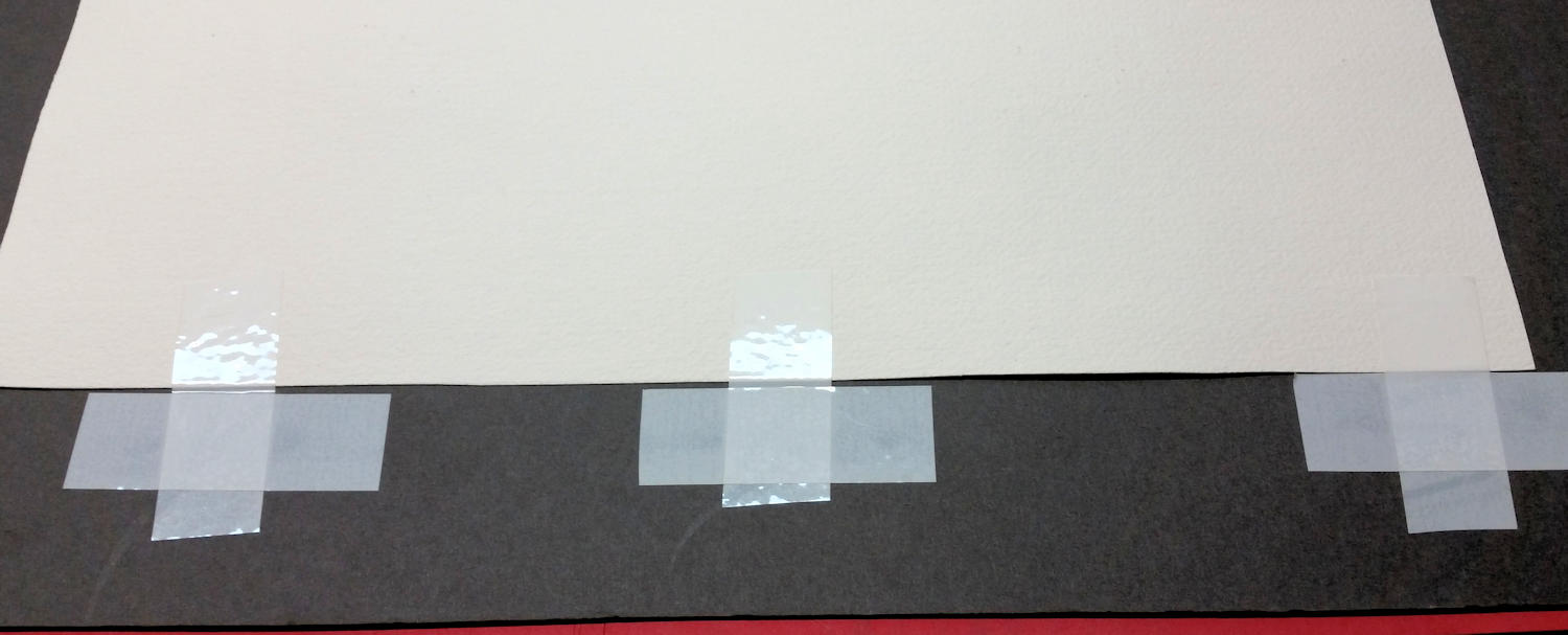 A final way to hinge your painting to a mat is to use mulberry paper. As you can see, this paper is very fibrous and strong. Just cut hinges in the shape and size as the tape demonstration above. I used this method extensively at the beginning of my art career. With larger paintings, such as full size watercolor paintings, you may need to use four or five sets of hinges across. Then use Elmer’s paste to adhere the hinges to both the artwork and the mat. Remember, do no harm and be able to undo your actions if you need to.