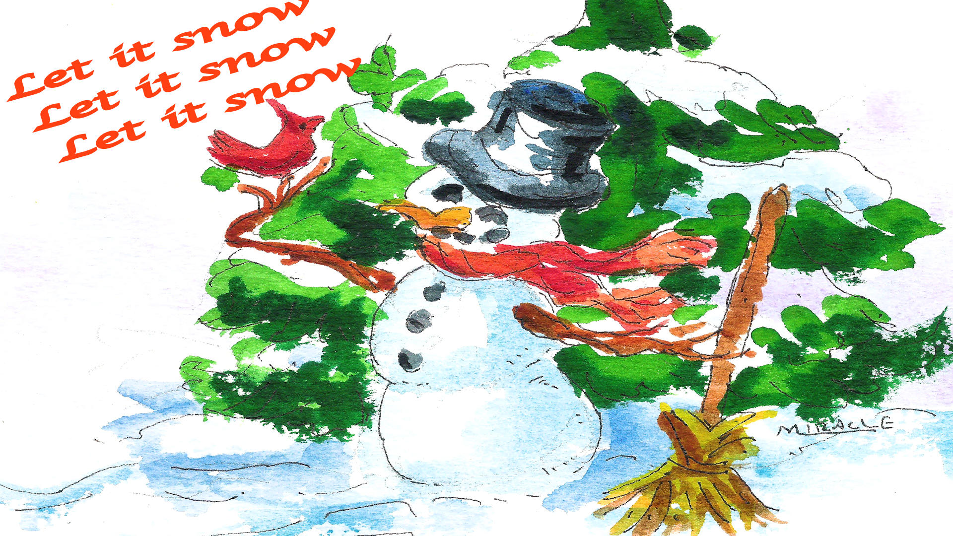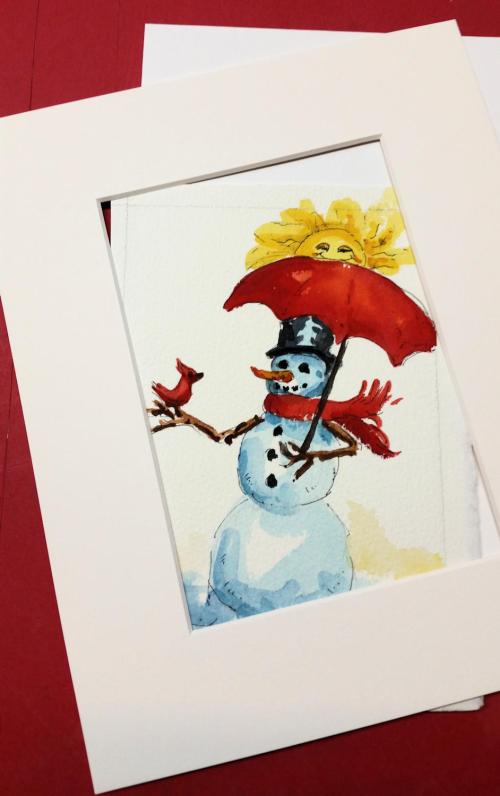 In this small snowman painting, you can see that I’ve hinged the mat all the way across at the top. I use my thumbnail to press down on the framer’s tape. To remove the tape, apply a little heat from a hair dryer.