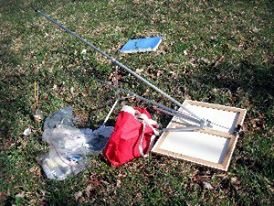 This is a typical French easel. It is a wooden carry box and easel all together. These have been around for over 100 years. There is also another smaller French easel called a half-easel. Both weigh quite a bit and, in my opinion, not too comfortable to lug around.