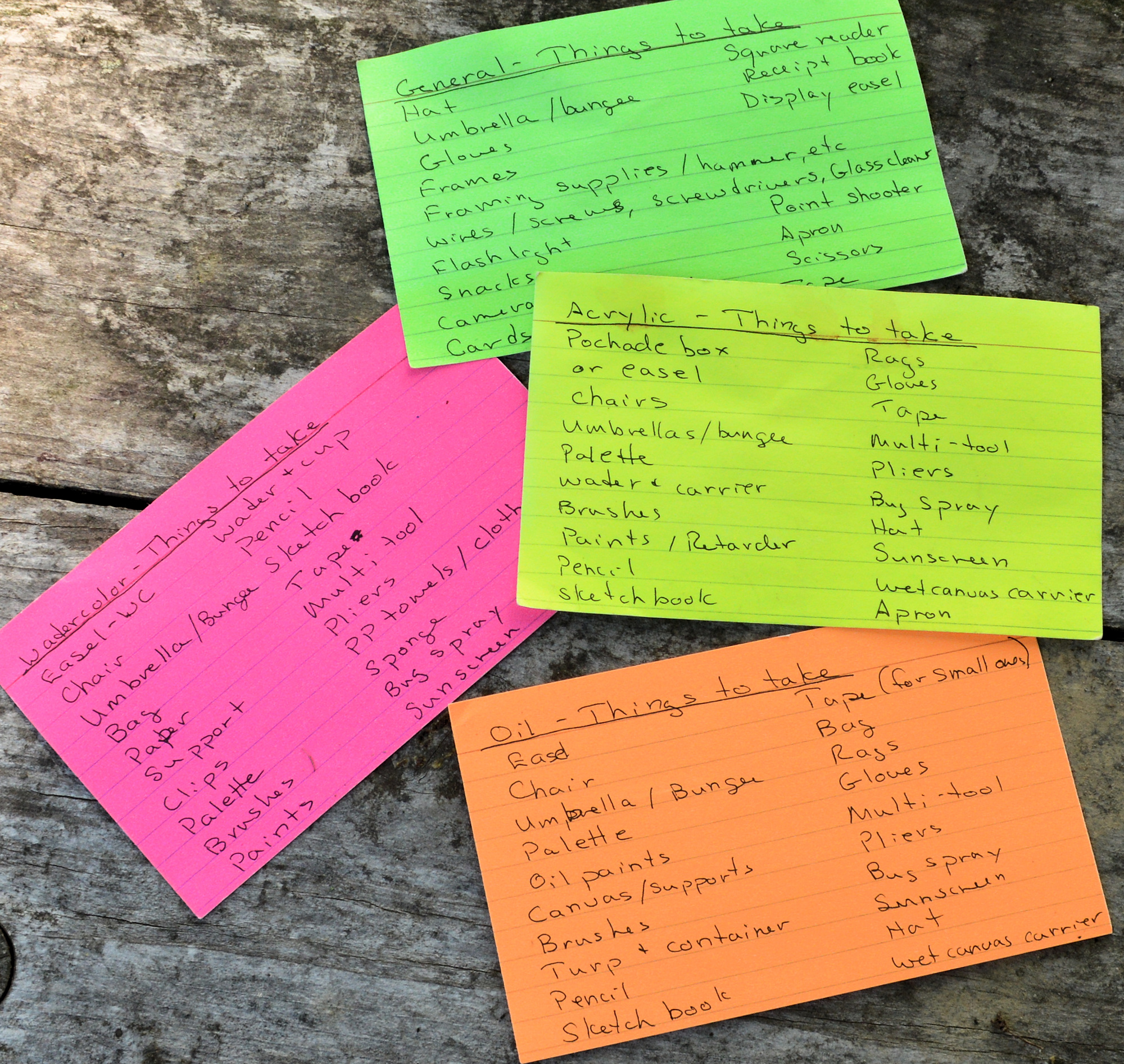 Many of the items that I carry with me are the same, but some are devoted to acrylic painting. Paints, types of brushes, larger water jar, rags, etc. For oils that would be oil paints, brushes, and two jars of mineral spirits (one for cleaning brushes and one clean). Backpacks are cheap so just keep one packed for each of the type of work you wish to do. I have made separate lists for each type of plein air art activities that I do to remind myself what to take.