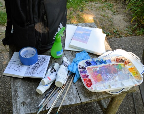 The typical gear that I take with me for acrylic painting. Backpack, selection of brushes and paints. portable travel palette, sketch book, panels and canvasses, gloves, water. Not shown would be a container for water. For oil paint, there would be two containers of mineral spirits and a portable oil paint palette.