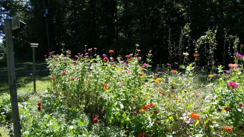 The zinnias that I use for cutting are still going strong. Some of them are taller than me! In the background are the desiccated stalks of the sunflowers that the goldfinches have stripped. And those poles on the left hold motion sensitive lights which help scare away the night critters. Sometimes.