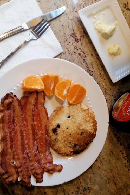 Normally I stick with a light breakfast – fruit and yogurt, fruit smoothie, oatmeal, etc. But on Sundays we go a bit overboard. My husband loves to cook big breakfasts. Sometimes I even get to put in an order. So today I asked for his out-of-this-world blueberry pancakes. They are so good. One is enough for a normal person but you could eat two if you really want to get stuffed.