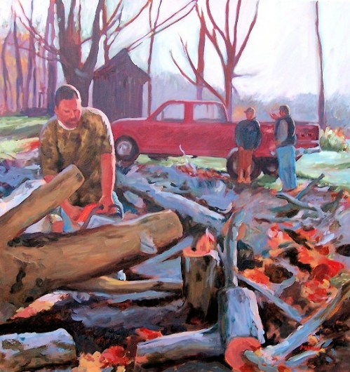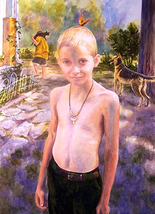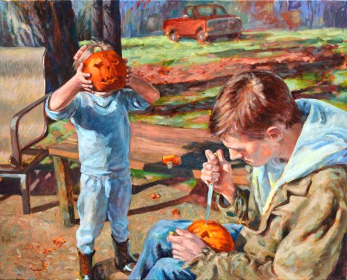 The Boy with the Butterfly, watercolor, extra large. A butterfly landed on my son’s head and just stayed there for several minutes, enough time for me to capture several photos. My son has always had a somewhat fey or faraway look to him and I think this captures him perfectly. The other son and pets are in the background. This is one of the largest watercolors that I’ve painted and I had to use Arches on a roll and stretched on a large piece of finish-grade plywood to keep the paper flat. Framed, it is quite an impressive painting.Saturday Morning, oil on canvas, 38 x 40. This nearly square painting is extra large. The story here is often seen in this country area on the weekends. Men cutting firewood. That is actually my neighbor in the foreground with a son and my husband in the background. The early morning mist was just burning off. They don’t waste much time getting out and getting chores done around here. Cat and Boy in a Tree, oil on canvas. My son built treehouses all over our property. Sometimes the cat would follow him up there, too. I liked the composition and the fall colors, painted with heavy impasto.Pumpkin Head. Oil on canvas, 29 x 26. Another painting with a story behind it. My son carving a pumpkin for my granddaughter. She asked for a happy face but he said, no, they’re born as pumpkins and they die as scary jack-o-lanterns. Somewhat macabre, I think. You can only tell it’s a girl by the pink ribbon in her hair. Exodus, acrylic on canvas, 50 x 34. Part of my Intimate Spaces: Beach Series paintings, I was attracted to this subject for the subtle references I drew. The family is leaving the beach at the end of the afternoon. Mom, Dad and the baby are anonymous but the young boy glances back at the ocean longingly. This reminded me of the biblical story of Exodus and held many other layered meanings for me at the time. The actual canvas is a mix of detailed painting with impressionistic strokes in the foreground and background. A Little Blue (on a Rainy Day) Final, oil on canvas, 24 x36 It had been raining for days and looked to be raining for several more. I set this still life up in my studio. The poor flowers are bedraggled survivors of the downpours. Roses, peonies, what have you. I elected to concentrate on three colors: blue, pinks, and yellow. And my eclectic group of vases and other bits. Check out the step by step under the tab Artworks.