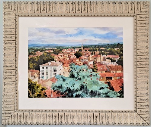 Avignon from the Palais des Papes, watercolor, 19 x 29. Framed. This landscape is one of my favorite watercolor paintings. The scene is from the Palace of the Popes, set on a hill in Avignon, Provence, France. I was on a bicycle tour of Provence and this was one of our stops. The scene just took my breath away. It still reminds me of a grand adventure so long ago and I enjoy looking at it every day.