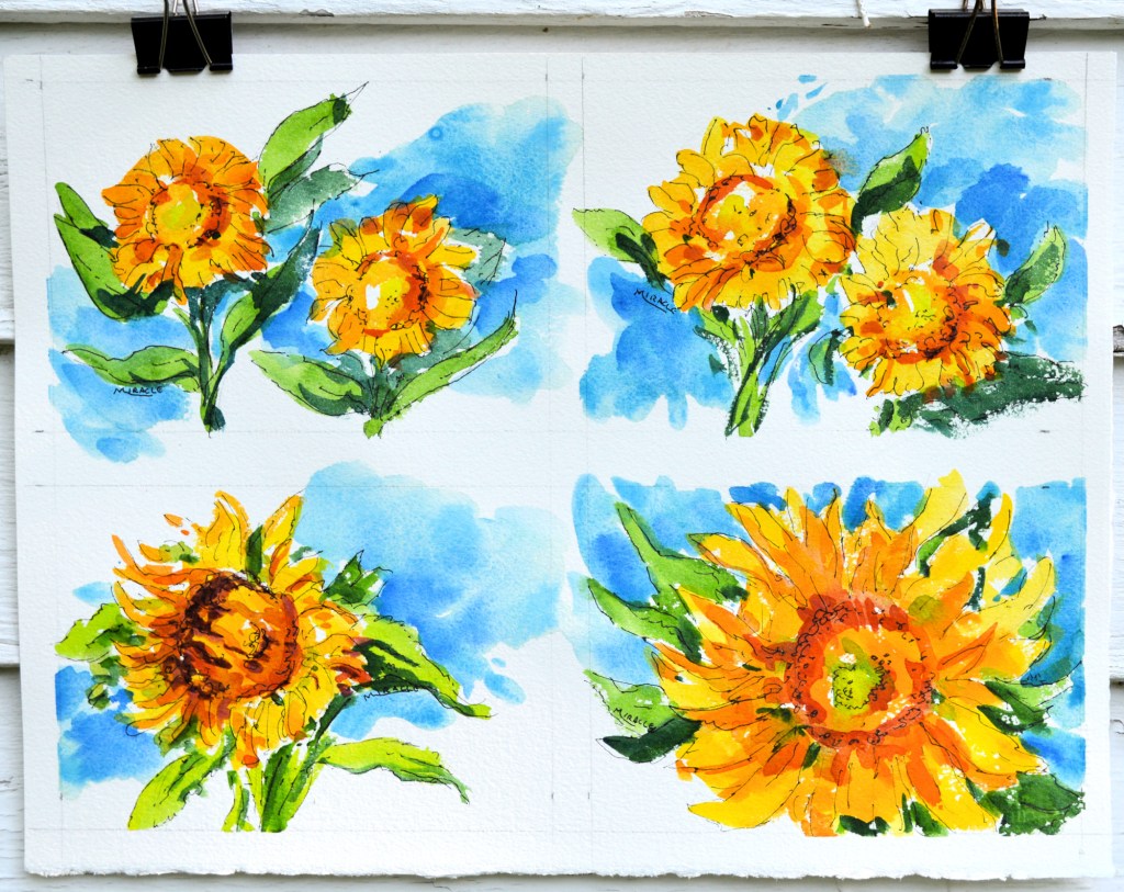 I did several sheets of minis. I can get four 4 x 6 on a quarter sheet of watercolor paper. Although I often repeat a theme, they never turn out the same. I buy mats and backs in bulk so it’s pretty easy to prepare them for display or shipping.
