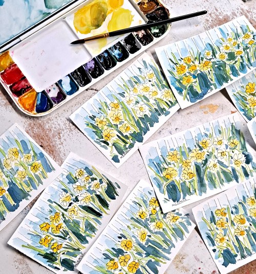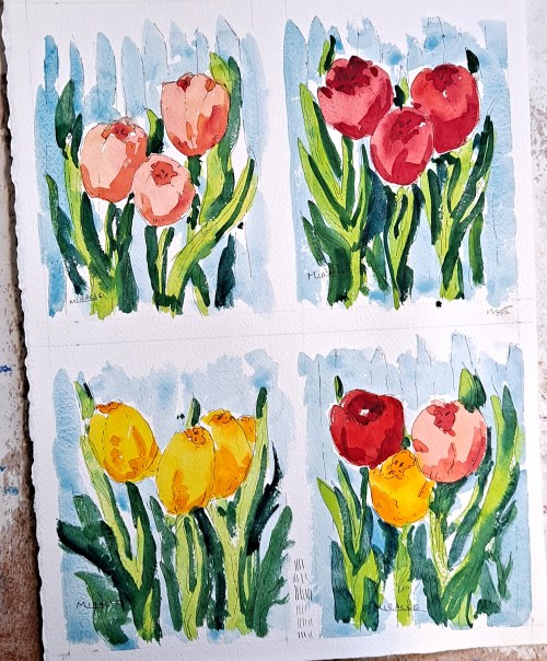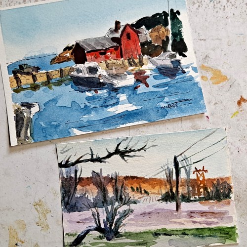 These days, the primary size of the small paintings are 4.5 x 6.5 plus a border for matting. Very easy to assemble. BUT…I also create 4 x 6 size painted postcards. These are so fun. I cut out a bunch, maybe 100 of that size. I take them with me on my travels, make quick original sketches, and then mail them back to friends. Surprisingly, all of the postcards have arrived safely at their destinations and my friends are so surprised.