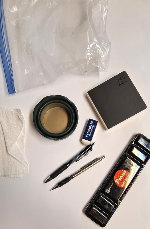 I keep a quick sketch bag at the ready. Since my favorite tool is watercolor, paper, and pen, this is what I keep in my bag.