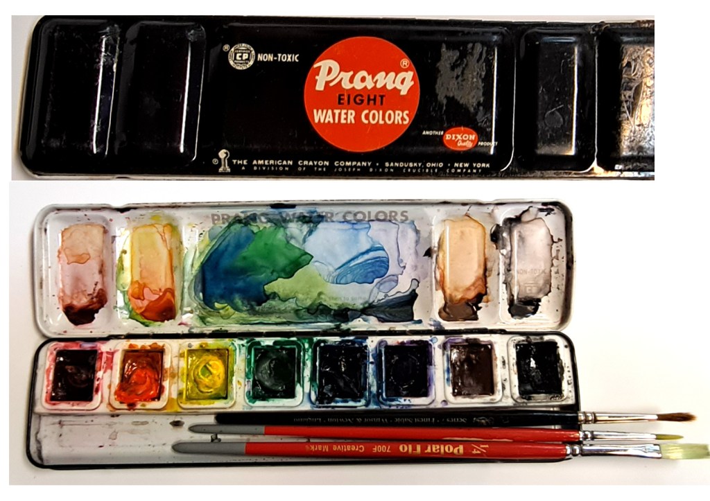 - An old-fashioned metal PRANG watercolor box, filled with my good paints, only eight colors