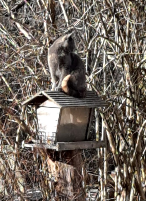 Or, looking out my kitchen window to see my cat perched on top of the bird feeder.  She always hopes that some feathered creature will fly her way, but most often the avian visitors too wary.