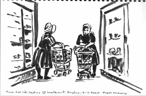 Two Amish ladies at Walmart in the frozen food aisle. This was done from memory, not a photograph. Brush pen.