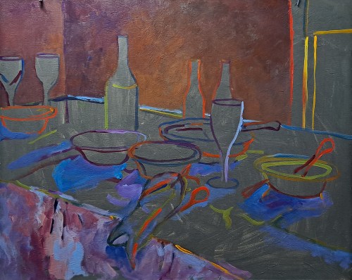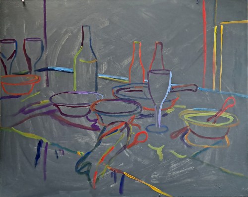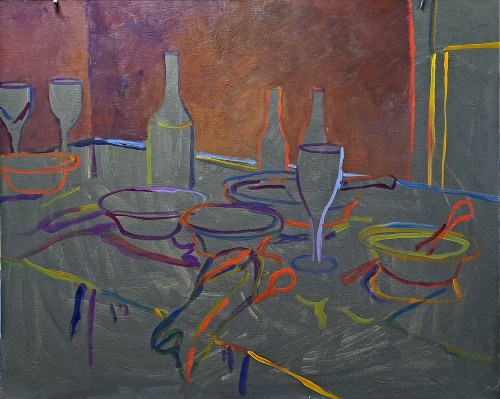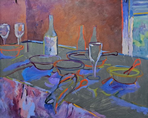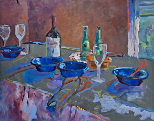 After the Dinner Party, step 1. Here you see the canvas toned with greyish/green. On the pencil drawing, I have outlined the main shapes in primary colors.After the Dinner Party, step 2. Here I have begun to block in the larger shapes. I usually start with the background but not always.After the Dinner Party, step 3. The font (shadow side) of the table is added along with the shadows of most of the main objects.After the Dinner Party, step 4. Adding more colors, and some highlights. I don’t concern myself with covering up the colorful outlines but they peek through in places, enough to add some pizzazz.After the Dinner Party, step 5. Starting to paint in the remainder of the objects – blue dishes, glasses, bottles. After the Dinner Party. Acrylic on canvas, 24 x 30. Kit Miracle this is the final version of the painting. I’ve tweaked a few things. I didn’t like the shape of the wine bottle, added a few more highlights here and there. The whole idea with this type of impressionism is that the brush strokes are clear and bold. Your eyes will fill in the rest. I think this makes a much livelier painting than if I had meticulously smoothly brushed all of the shapes.