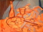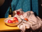 Every once in a while, I like to challenge myself to paint in the style of another painter.  In this case, I thought I would emulate the still life paintings of Cezanne.  This is definitely not a copy of one of his paintings, but includes many of the objects that he painted – fruit, wine bottle, glass, table-cloth, yellow table, and my grandmother’s celluloid-handled knife.  Even with this limited set of objects, it actually took a while before I was comfortable with the arrangement.