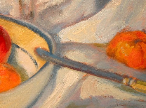 Blue-rimmed bowl still life, detail.