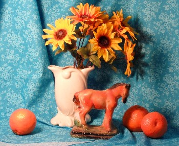 Initial still life with chalk horse, white vase, sunflowers and oranges