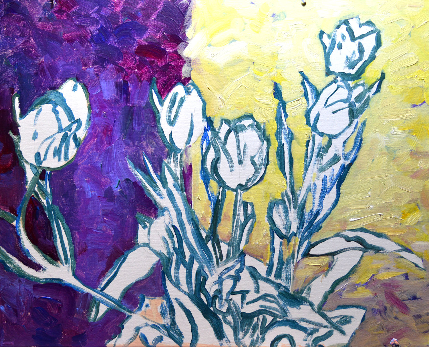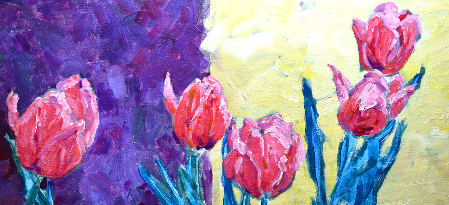 This is a close-up of the tulips after they were painted. Many shades of pink and lavender with highlights of light and pure white. You can see hints of the orangey underpainting poking through which makes the tulips come alive.