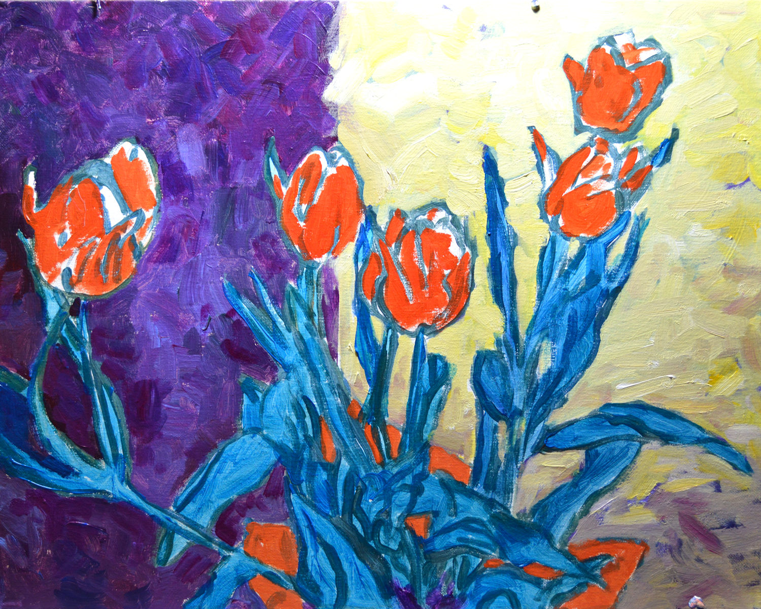 I then underpainted the pink tulips with a bright orangey-red and the leaves and stems with a transparent blue.