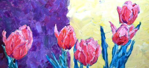After this, I worked on the tulip flowers with shades of pink and lavender, some purples for shadows.