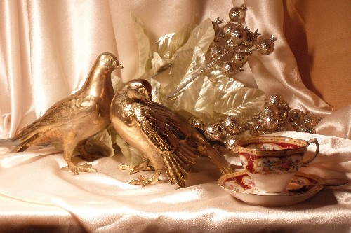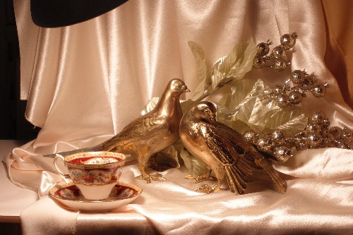 In this case, I had a pair of brass doves and decided to work a theme around them. Just for a challenge, I wanted it to involve mostly shiny objects. Rather than line everything up in a row, I like to overlap objects. In this particular case, I chose a shiny satin fabric, some silvery foliage, a china cup, and a silver spoon. I played with the light, moving it back then forward. I also tried out some colored gels for the light but in the end, did not use them.